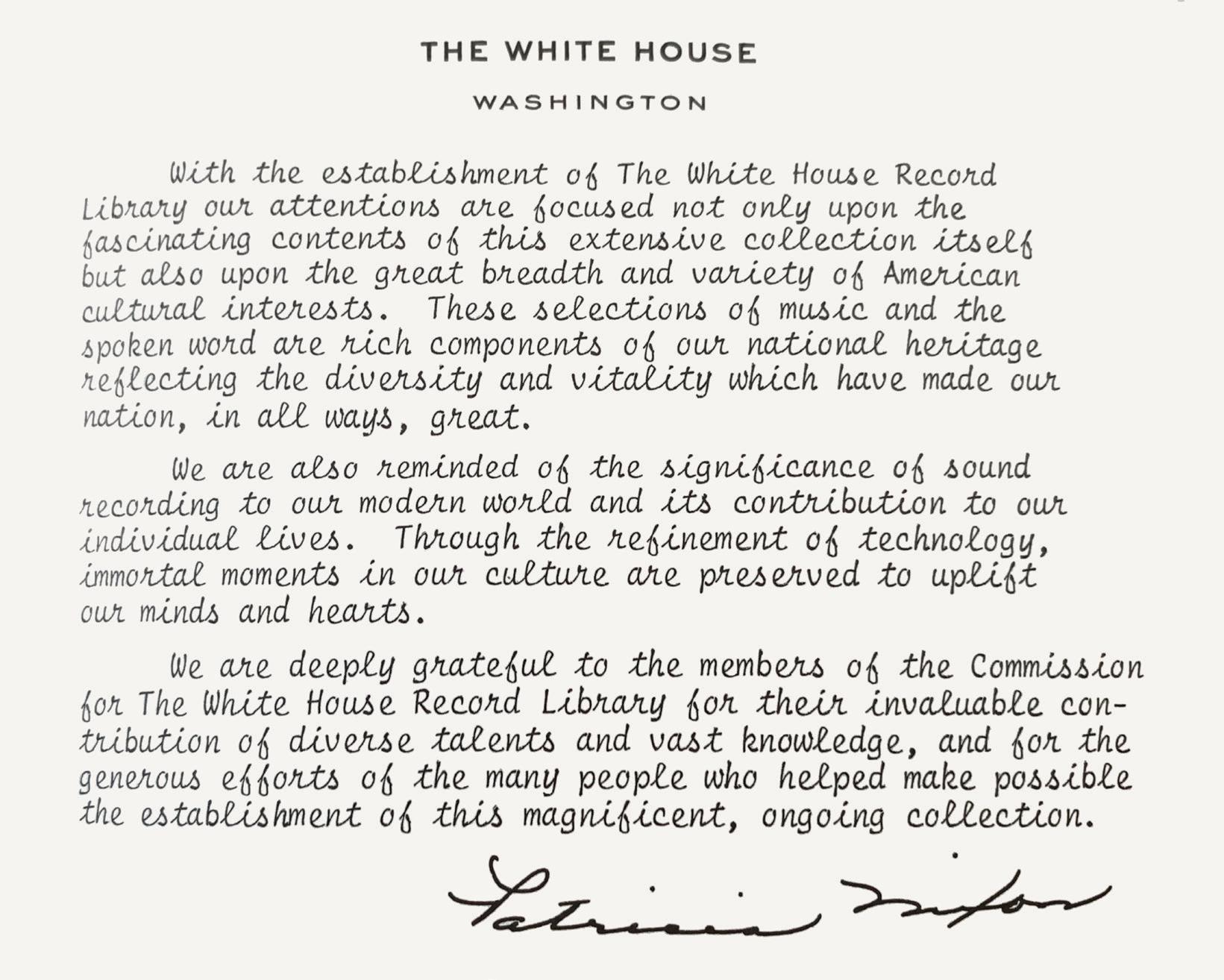 In the early days of the Nixon administration, the Recording Industry Association of America, learning of a book library donated to the White House by the American Booksellers Association, offered to provide the White House with a collection of recorded works—music and spoken word.