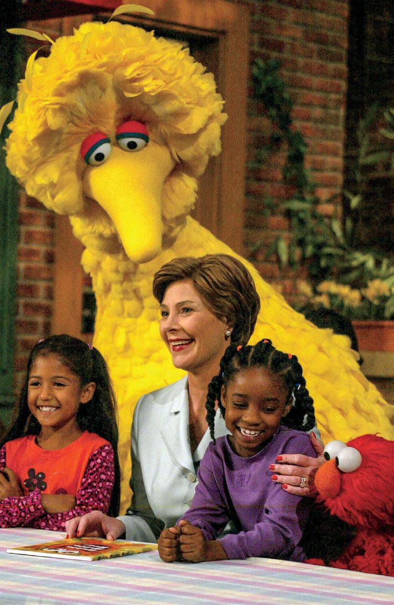 Mrs. Bush laughs with Big Bird and Elmo while taping Sesame Street in New York, 2002. The children, Sydney Martines and Sienna Je eries, read a book with Mrs. Bush.