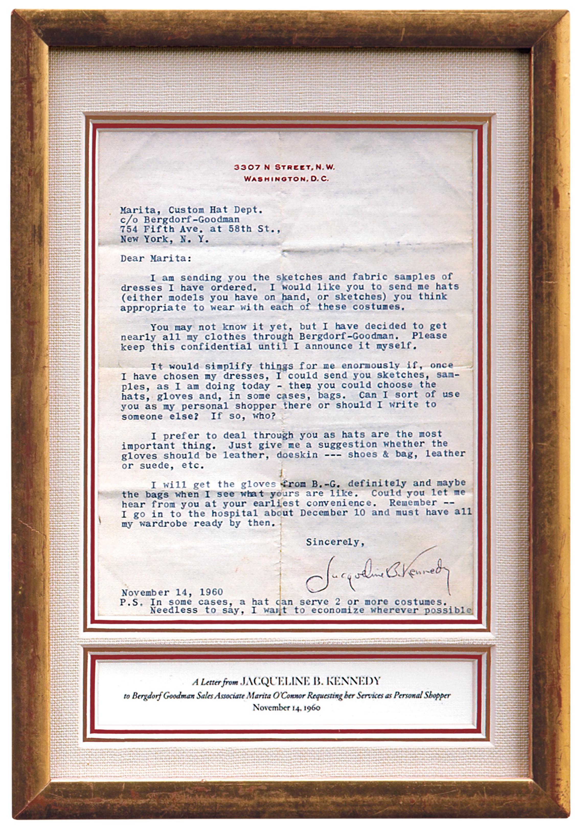 Bergdorf saleswomen, known as “vendeuses,” memorized the measurements and tastes of elite customers who could visit in person, but the heavily pregnant incoming rst lady would have to place her orders by letter and sketch. She would actually give birth to her son, John F. Kennedy Jr., on November 25, 1960, well before the December 10 date she anticipates in the letter. She asks O’Connor to be her “personal shopper,” selecting accessories to match sketches of costumes already selected. A former Bergdorf-Goodman personal shopper