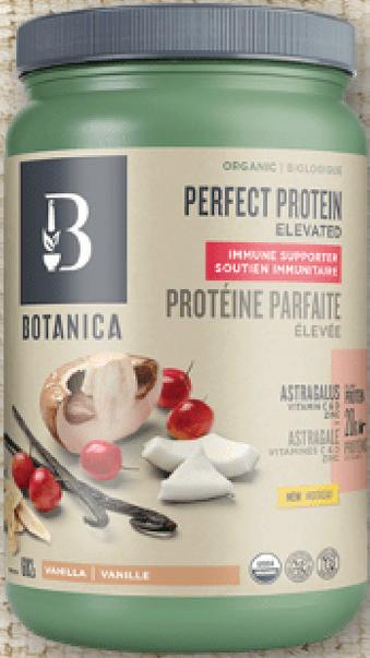 Botanica Perfect Protein Elevated Immune Supporter is an organic vegan protein powder blended with a full serving of 4 immune supporting supplements – astragalus, vitamin C, vitamin D and zinc. With 20 g of plant protein packed with naturally occurring vitamins, minerals, antioxidants, healthy fats, fibre, and immune supporting superfoods. Contains Astragalus which helps increase resistance to stress, vitamin C and vitamin D support the immune system, Zinc maintains the health of immune cells.