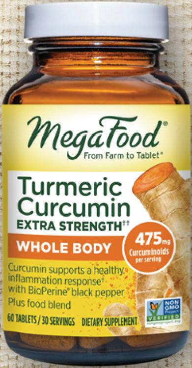 MegaFood Turmeric supports a healthy inflammation response for the whole body. It includes their proprietary Turmeric Strength Blend (500 mg turmeric root extract & 200 mg turmeric root) to deliver a guaranteed minimum of 475 mg curcuminoids per serving. BioPerine®, a patented black pepper extract, a Golden Harvest Fruit Blend and their Fruit Phenolic Blend for a natural source of phytonutrients and additional nourishment plus holy basil leaf extract.