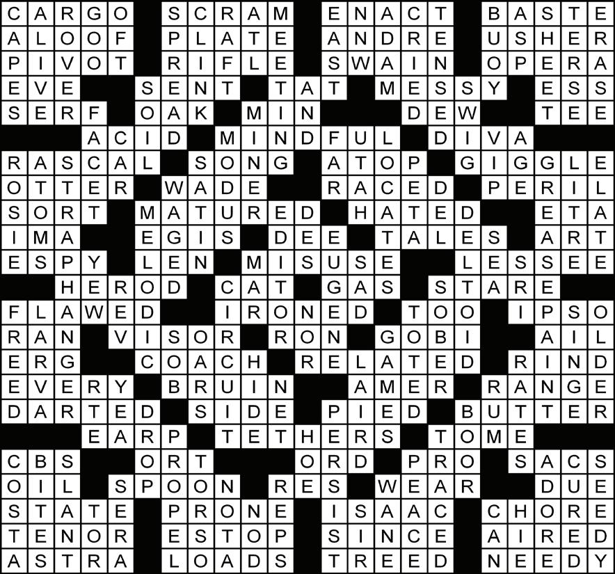 1 Dry out 6 Genie’s prison 10 Wheel part 15 Scale notes 18 Marry in secret 19 Stopwatches and hourglasses 21 Cooking spice 22 Soapstone 23 Sitting Bull’s tribe 24 In -- (as one) 25 Deliver a speech 26 Buzzing place 27 Scottish cap 28 Print media 29 Proprietor 31 Dried grape 33 Greek mountain 35 Monocle 36 “You Only Live --” 37 World’s highest peak 38 Releases 40 Long gun 41 Move swiftly 42 “The Picture of -- Gray” 44 Send along 45 Hearts or clubs 47 Sweet potatoes 51 Concern of ethicists 52 Nonconformist 53 “-- With Wolves” 55 Coffee holder 56 Actress -- MacDowell 57 List of dishes 58 Rope for a cowboy 60 Overact 62 Tall grass 63 Pinpoint 65 Brick-lined oven 66 Make numb 67 Herbal brew 68 Jewish month 69 Broken-off piece 71 Very little 73 Tricky 75 Narrow opening 76 Fakes 77 Not at all ruddy 78 “Wheel of Fortune” purchase (2 wds.) 81 Burning 83 Salon item 84 Email command 85 Acct. earnings 87 Like a solarium 90 Hard to get 92 Large hawk 94 Tabula -95 Willow rod 96 Buddhist temple 98 One of the Olympians 99 Nut for pies 100 Rep.’s counterpart 101 Categorized 103 Wiped 105 Kind of pigeon 106 Minerals 108 Like the Piper of Hamelin 109 “To -- own self be true ...” 110 Briny 111 Pointed arch 113 Went slowly 114 Chunk of turf 115 Rooms in old houses 118 Flies high 119 Agreeable 120 Cabbage salad 124 One-cell organism 125 Contour 126 Firth or Farrell 127 Chicken -- -- king 128 Go here and there 129 Candle 131 Par for the course 133 Sword 135 Become 136 Mental objects 137 Compact 138 Likely 139 Grads-to-be 140 Military group 141 Yield 142 Measures of farmland