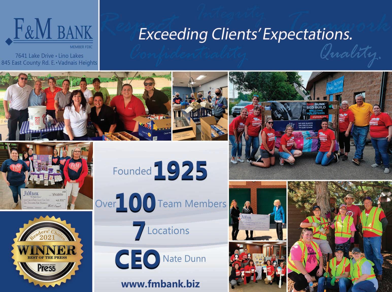 F&M is a true community bank founded in 1925. Beyond solid financial footings and modern, full service branches in Vadnais Heights and Lino Lakes, what sets F&M apart is the culture and true relationships with customers. F&M can meet virtually any banking need including full business banking, home mortgage, and private banking and services. We focus on tailoring products and services to meet the needs of the small to middle market businesses and their owners. The F&M team goes the extra mile to build a strong and trusting foundation for our clients and community. Our team is dedicated to this community, volunteers with local organization and takes pride in our commitment.