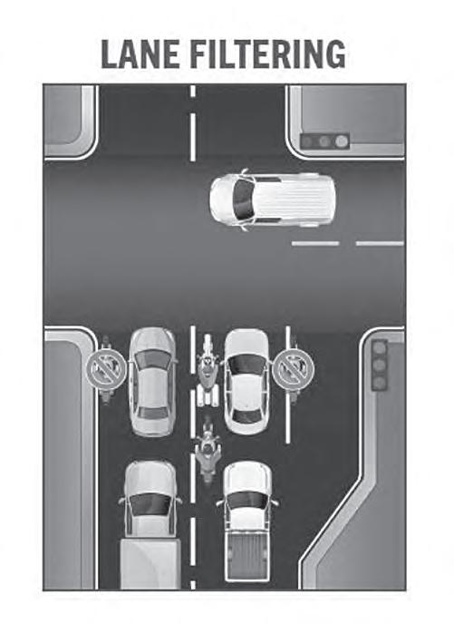 Lane filtering, on the other hand, is allowed when two or more lanes of traffic are traveling in the same direction and traffic is not moving. This allows motorcyclists to move through stopped traffic, including at traffic lights or in congestion, provided they