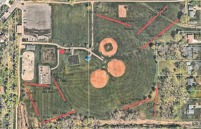 around the basket at varying distances, ranging from 5 to 30 feet. The course itself will follow the perimeter of the park. The first hole is located by the skate park. “I think you’ve really maximized the perimeter use of the space,” said Centerville Mayor Nancy Golden.