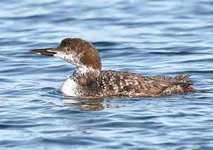 time preening. Their feathers have a soft beige hue, with an emerging necklace. The old warriors look strong. Many are in the early stages of a full body molt, during which their beautiful black and white breeding plumage will be replaced with gray and white winter feathers. Their eyes also will begin to fade, losing their iconic brilliant red color. Last week, we spotted a smaller adult Loon undergoing fall molt. We named him Scruffy. As you can see, he looks a little rough around the edges, with white and gray feathers slowly replacing his necklace and black and white breeding plumage. Scruffy likes to mix it up with the juveniles. This morning, we found Scruffy circling a juvenile, as they dipped their bills and hooted at each other. Their immature