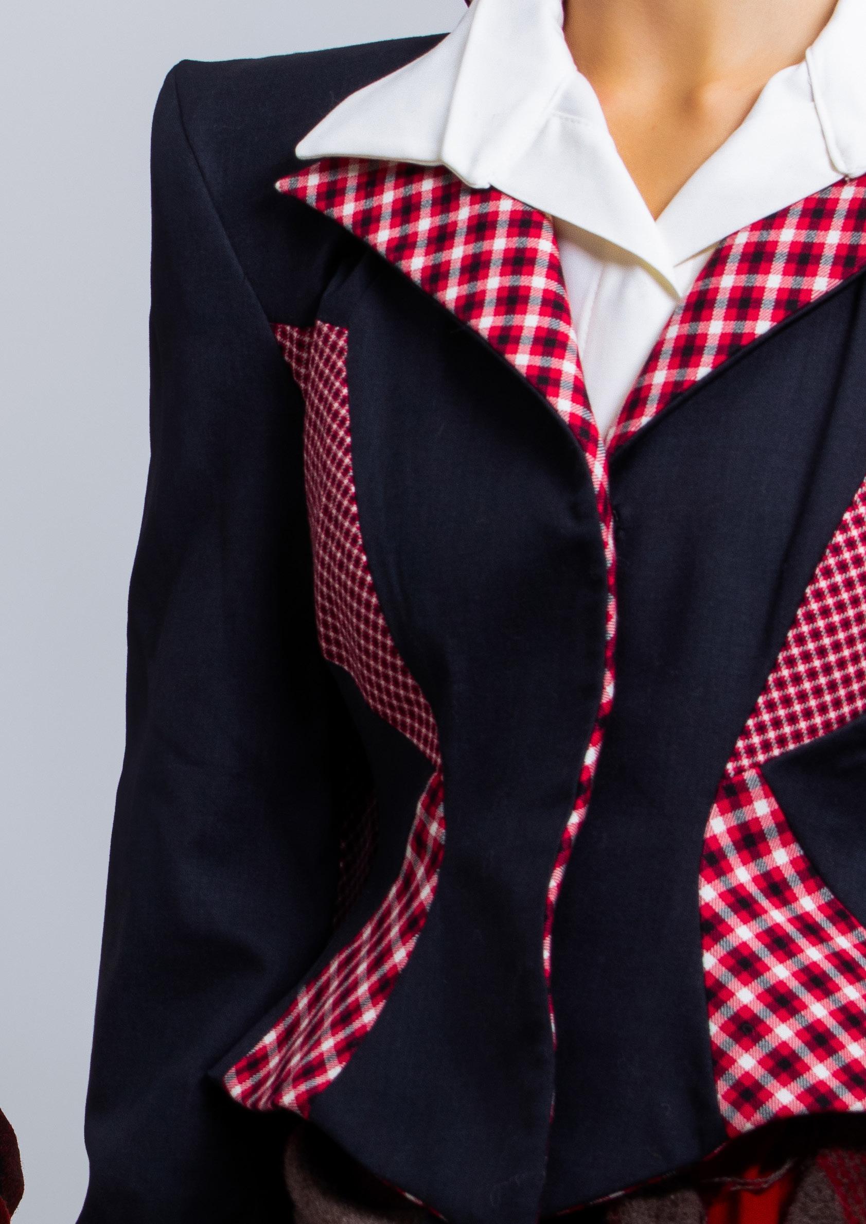 The tailored jacket is extended, creating volume into the hem which in turn forms the beautiful folds that fall softly. Red and black coating is combined with charcoal wool suiting panel inserts. Particular cutting and patternmaking is completed to ensure a perfect look.