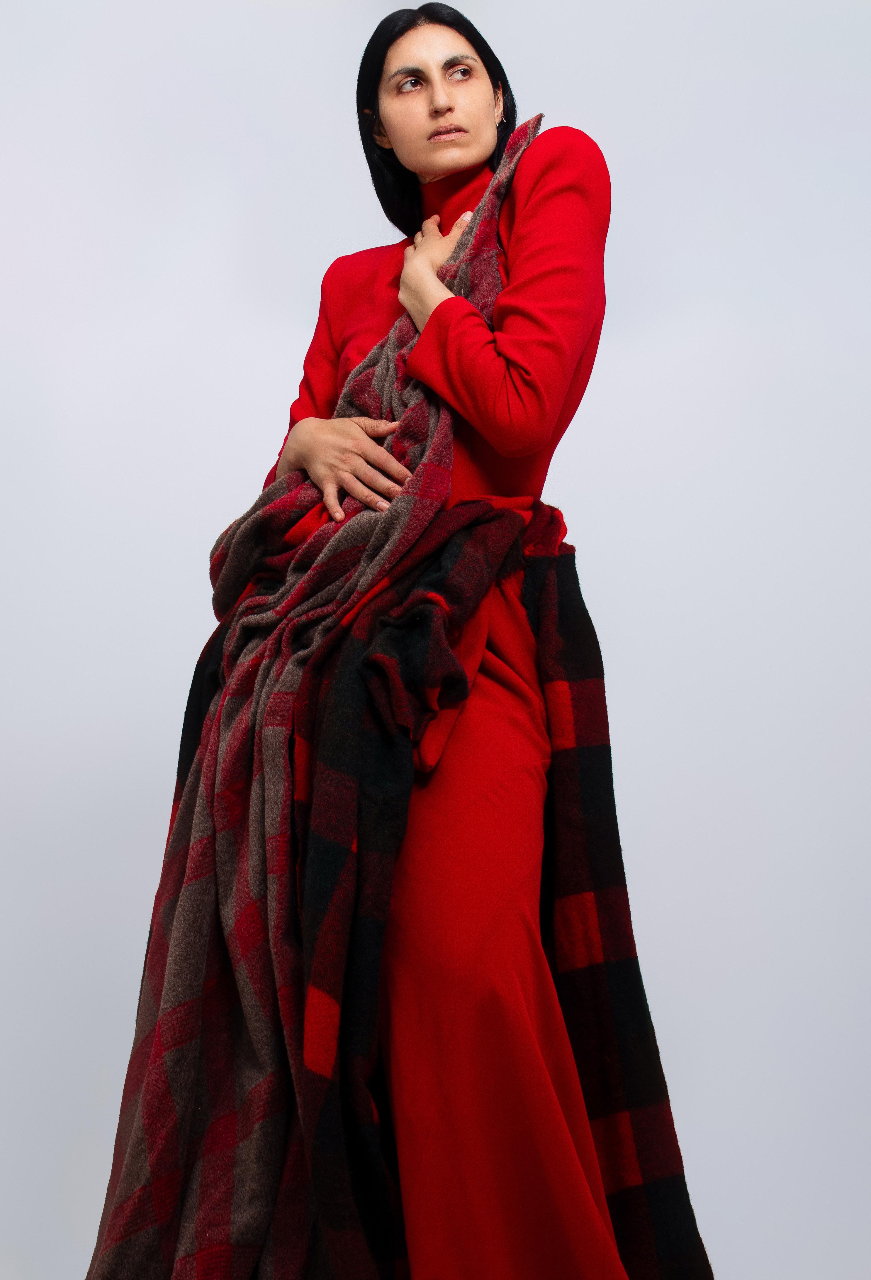 A two piece look, the signature twisted gown in red lay beneath a draped alpaca/wool blend coating draped dress. Layers of alternate textiles draped, stacked and twisted around the hip line of the body creating volume and shape through these techniques.
