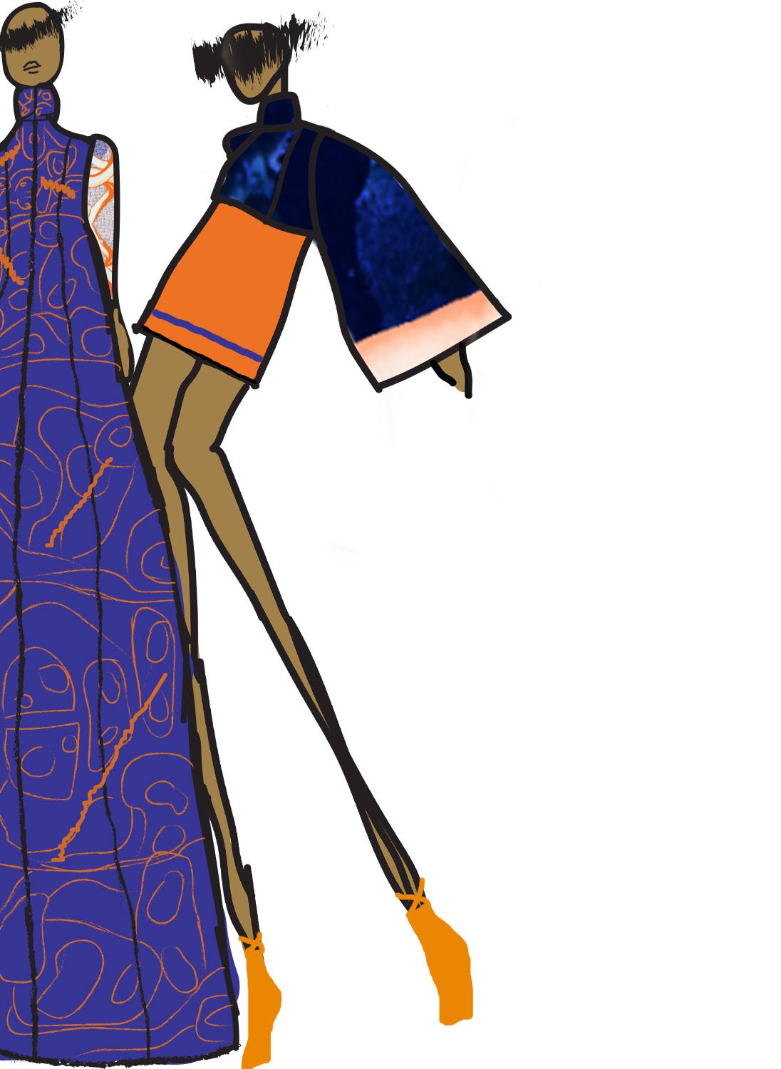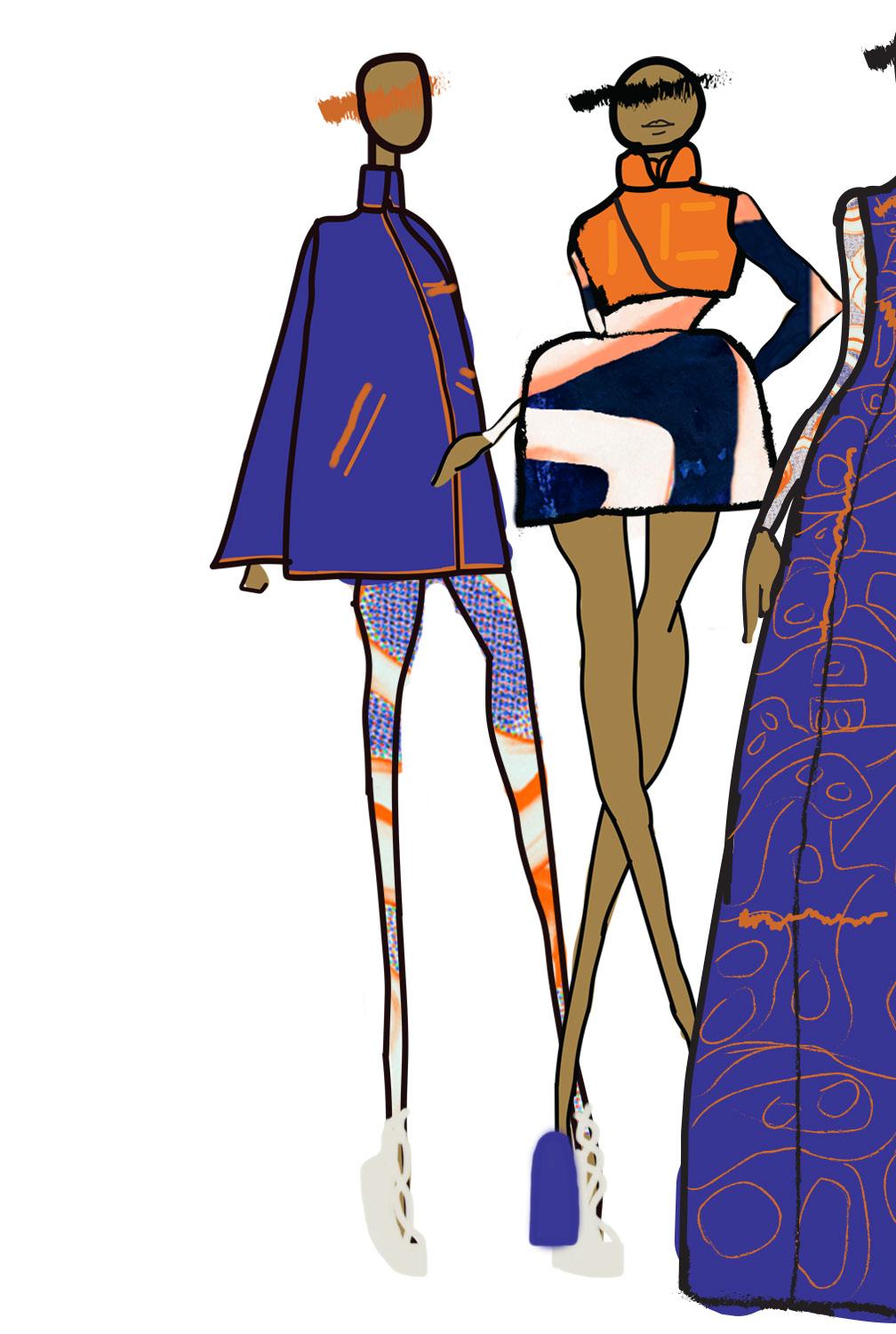 Puff N Puff is a vibrant womenswear collection that draws inspiration from the architecture of Antoni Gaudi, contemporary sportwear and puffer jackets. The collection incorporates a complimentary colour palette of oranges and blues, including wavy sporty inspired custom designed prints. Organic lines are repeated using couching techniques influences by Antoni Gaudi. Puff N Puff blends. Puff n Puff includes customised print designs that are crafted both digitally and by hand. Puff N Puff ombines a mix of surface treatments and finishes to create vibrants pops of contrast via piping, couching, topstitched, exposed metal hardware. Puff n Puff Skin collection is hugging activewear is blended with puffy and padded volumious proportions.