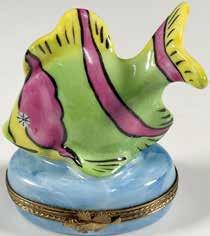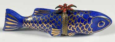 A Medieval style fish with its tongue sticking out. Dark gray with red and gilded accents. Herend backstamp.