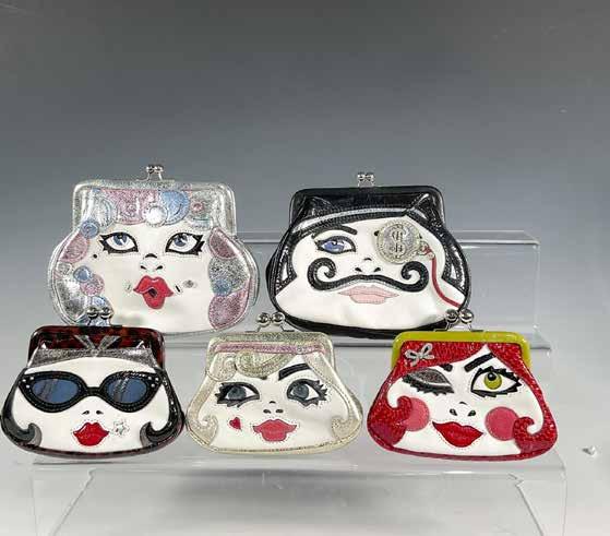 Five patent leather purses in assorted sizes, each adorned with charming faces on the front. Ranging from the smallest at 5.5”L x 1.25”W x 4.5”H to the largest at 6.5”L x 1.5”W x 6”H. All feature a kiss closure and the Brighton label inside, with the two largest including a removable chain strap.