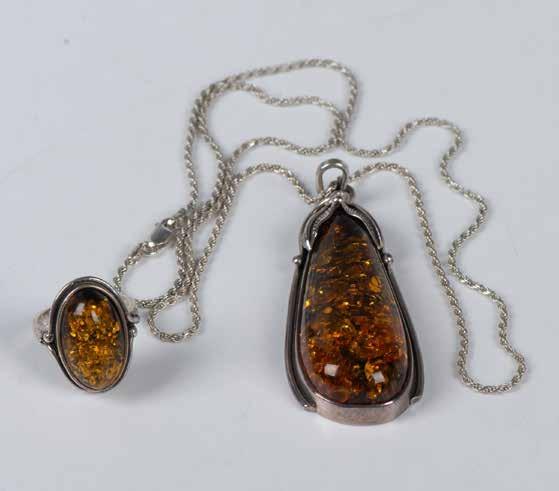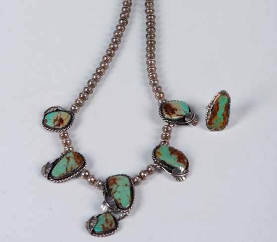 Handmade Southwest Native American pieces. The necklace has sterling silver beads and six turquoise stones housed in detailed leaf sterling mounts. It measures 22”L clasp to clasp. The ring is an irregular shape turquoise stone set in sterling silver and it is a size 8. Weight: 90g.