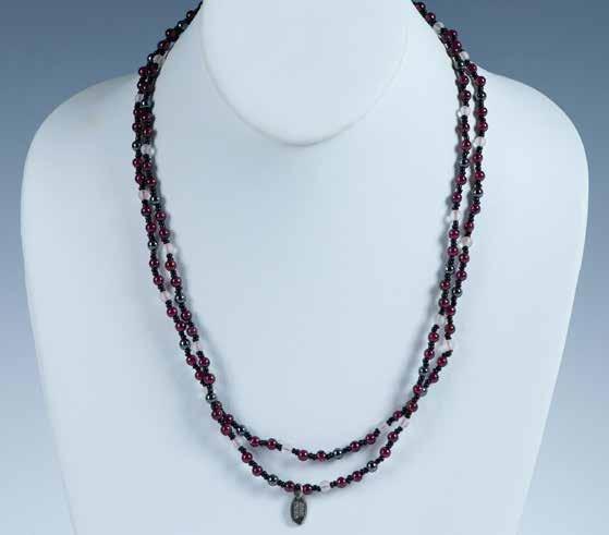 Four large medallions set in sterling silver float freely on a silver tone wire. Between each medallion are round and barrel shaped beads. 17”L. Medallions: approx. 1”1.25”dia.