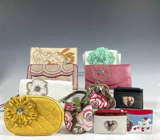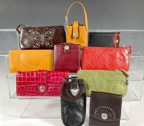 Eight leather wallets and four zippered pouches. The largest pink heart pouch is 7”L x 4.5”W. The larger wallets are 7.25”L x 1”W x 4”H.