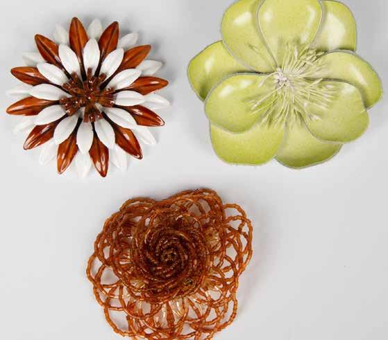 Two of the beaded necklaces are identical. Round discs with dangling strands on a suede cord. The pin is a similar style with more detail. The other necklace is a coiled ceremonial basket pendant on a silver tone chain. Beaded pendants: 2”dia. with 3.50”L bead strands. Suede cord: 18”L. Pin: 3.25”L x 1.50”W. Ceremonial basket necklace drop: 10.50”L.