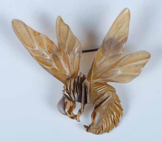 Fabulous hummingbird in flight with inlay of coral, turquoise, jet and abalone. Can be worn as a brooch or necklace. Charming pottery shaped pin with a dragonfly and inlay of coral, jet and mother of pearl. The back of this pin is signed Peynetsa plus several other markings.