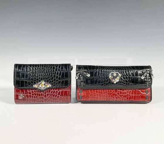 Eleven leather wallets and one small Love handbag with attachable strap. The Love handbag is 8”L x 0.5”W x 5”H. The larger wallets are 8”L x 1”W x 4”H.