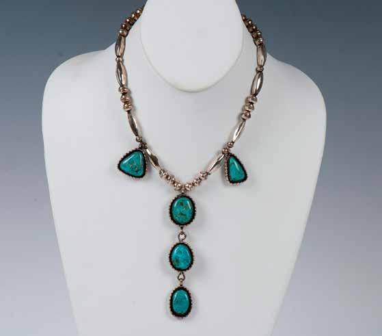 A handmade Southwest Native American piece. Navajo style necklace with sterling silver beads and five turquoise stones housed in stamped sterling mounts. It measures 16”L clasp to clasp. The three sterling drop stones measure 3.5”L x 0.75”W. 50g