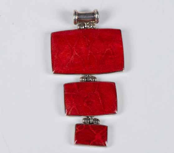 Pretty leaves and scrolls of sterling silver create the backdrop for this lovely pinkish color stone. Split loop for hanging, Backstamp R (probably for Richard Begay, Native American Navajo artist) . Other backstamp too worn to read. From top of loop: 2.25”L x 1.5”W.