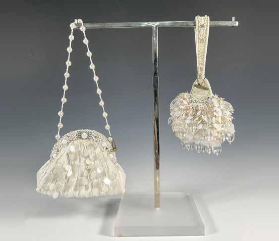 Both items are adorned with an array of beads, baubles, jingles, and other decorative elements. One is a roundshaped wristlet, while the other is a shoulder bag with a 10” drop length. The wristlet measures 5.5”L x 5”W x 7”H without the strap, and 12.5”H with the strap. The shoulder bag measures 8.5”L x 3”W x 6.5”H. Mary Frances metal nametag. Mary Frances label on interior. Includes dust cover.