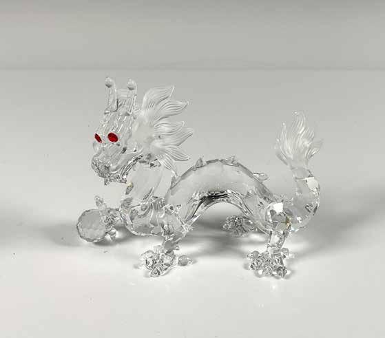 For the SCS Exclusively. Annual edition 1997 of the Fabulous Creatures collection. Features a cut clear crystal Chinese dragon with frosted crystal whiskers, mane and tail and red crystal eyes. Swarovski etched backstamp. Includes certificate and the original box, Dimensions: 10’’L x 9.5’’W x 5’’H.