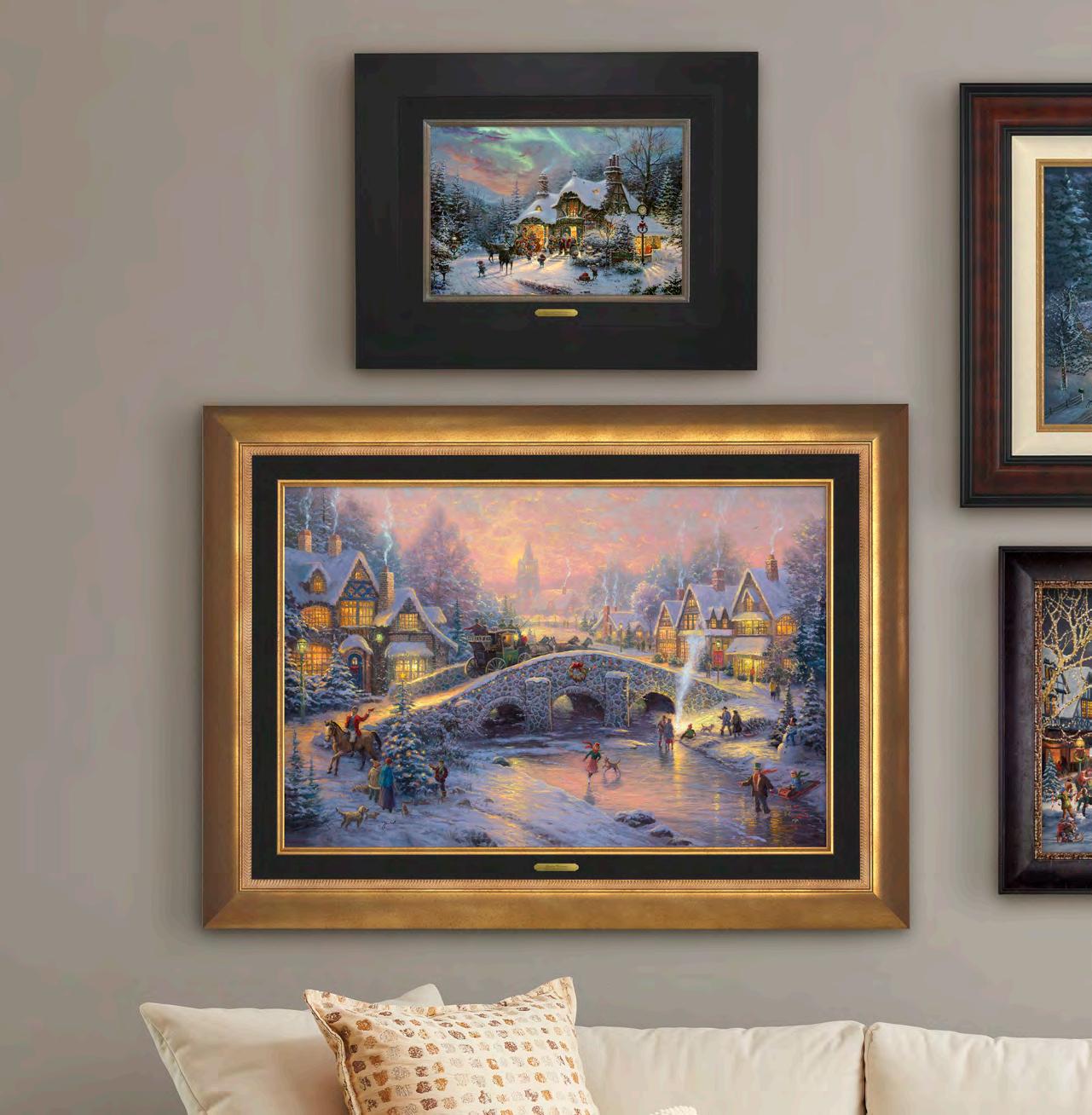 Thomas Kinkade Studios Gallery Wraps are perfect for any space. Each wrap is crafted with our premium canvas reproduction techniques and hand wrapped around a deep, hardwood stretcher bar. Hung as an ensemble or by itself, this frameless presentation gives you a versatile way to display art in your home. A. A Mother’s Perfect Day 14" x 14" | No. 69764 | $99 B. Mountain Retreat 14" x 14" | No. 63664 | $99 C. Sunset on Lamplight Lane 16” x 31” | No. 60098 | $189 A B C 10 | THOMAS KINKADE STUDIOS WINTER 2022