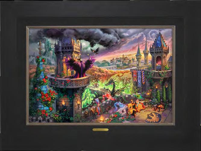 B. NEW Disney Maleficent Limited Edition (SN) Canvas Thomas Kinkade Studios is pleased to present Disney Maleficent, the story of Sleeping Beauty from Maleficent’s point of view after Princess Aurora pricks her finger on an enchanted spinning wheel in the castle tower. Maleficent, with her raven flying to join her, stands triumphantly on a castle turret. Flora, Fauna and Merryweather have snuck into Maleficent’s lair in the Forbidden Mountain to free Prince Phillip who races to save Aurora, whose kiss can awaken her from the endless sleep. Available in a variety of sizes and frames. Shown framed in City Black, 28½" x 37½". No. 120404-62099 | $1,100