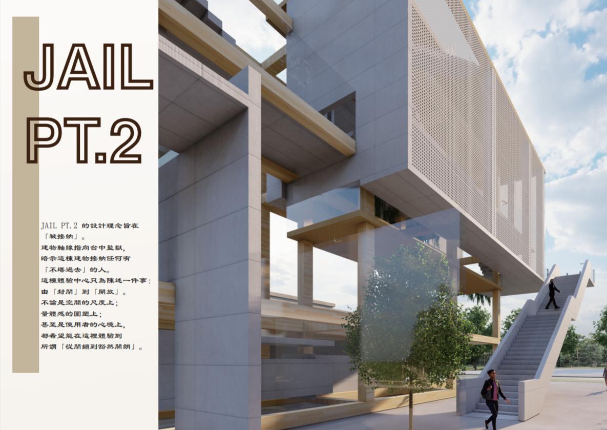 01 設計理念 JAIL PT.2 的設計理念旨在 「被接納」。 建物軸線指向台中監獄, 暗示這棟建物接納任何有 「不堪過去」的人。 這樣一棟體驗中心陳述一件事: 由「封閉」到「開放」。 不論是空間的尺度上; 量體感的圍塑上; 甚至是使用者的心境上, 都希望能體驗到 從閉鎖到豁然開朗這件事。