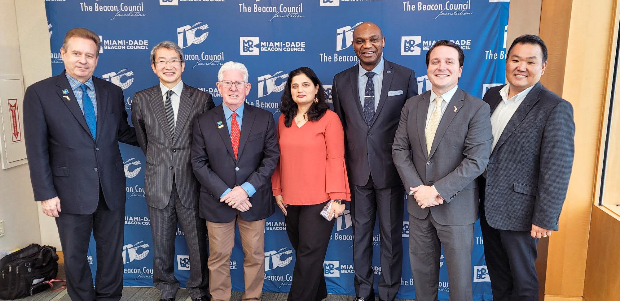 L-R: Dave Woodward, Executive Director, Florida Delegation, SEUS/Japan Association, Inc., Consul General Kazuhiro Nakai, Consulate of Japan in Miami, Mr. Bill Talbert, Interim President, The Beacon Council, Ms. Namita Uppal, Director & Chief Procurement Officer, Miami-Dade County Strategic Procurement Department, U. Desmond Alufohai, TJ Villamil, Senior Executive Vice President, Enterprise Florida, Inc., and Joshua Ho, Program Director, Asian Advisory Board, Office of Community Advocacy, Miami-Dade Board of County Commissioners. At the Beacon Council.