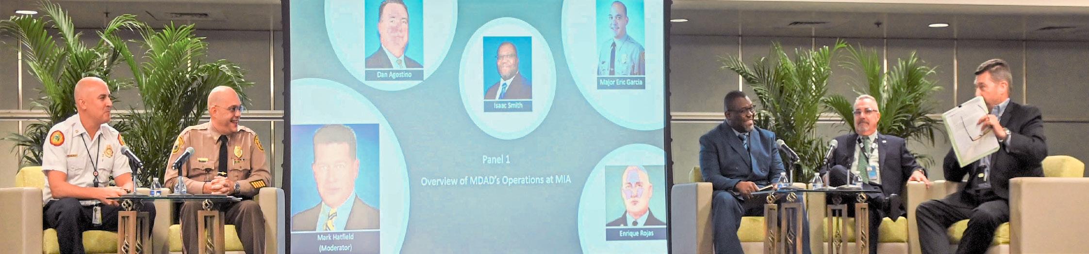 L-R: Mark Hatfield (MDAD), Dan Agostino (MDAD), Semcha Malika Ledad - Station Manager Air France & KLM at MIA/Chairperson, Airline Management Council), Gabriella Wuyke, Ph.D., - Quarantine Public Health Officer (CDC), Mercedes Garcia Perez - Head of Global Issues & Innovation (EU), Kzim OcakogluFirst Counselor on Mobility & Transport (EU), Christina Sleszynska - Executive Director of EACC, and U. Desmond Alufohai.