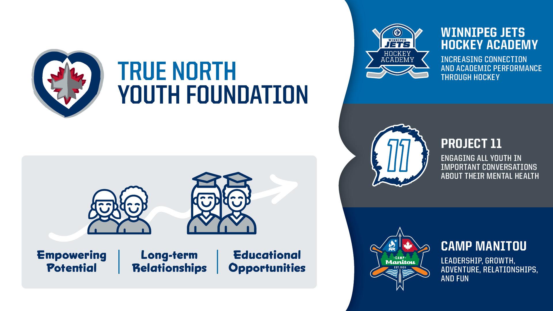 The True North Youth Foundation (TNYF) plays a significant role in how True North Sports + Entertainment, the Winnipeg Jets and Manitoba Moose give back to our community each year. The hand up over hand out approach has fostered a coordinated effort between the foundation’s three core programs –the Winnipeg Jets Hockey Academy (WJHA), Project 11, and Camp Manitou –in creating meaningful and lasting impacts on the youth of our community. Enriching, educational, sports-based and character-building programming facilitates physical, social, emotional and intellectual growth in young Manitobans and builds skills, values and self-belief that sets participants up for lifetime success. Over the past year, TNYF programs have positively impacted more than 87,000 youth in our province, and past participants continue to share the enduring positive influence the TNYF has had beyond their time in its programs.