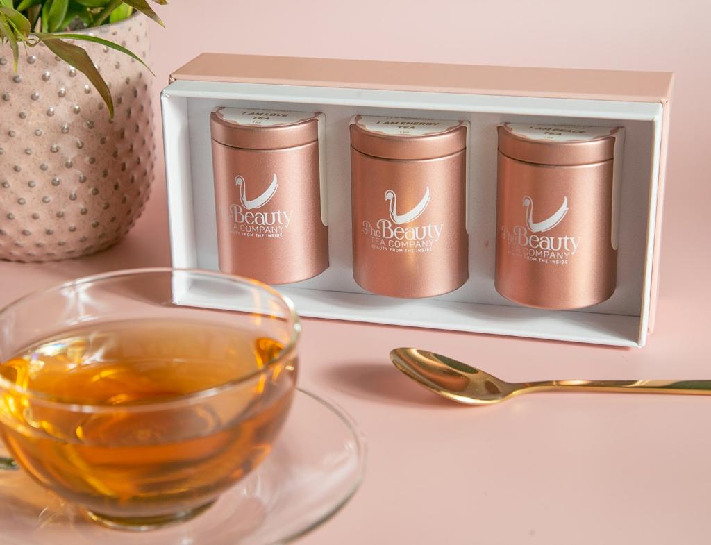 High-end The Beauty Tea Company box with three delicious white, green, and roboois teas (I am Love, I am Peace and I am Energy) delicately crafted with natural ingredients such as rose petals, blueberries and other delicious herbs. $34.99