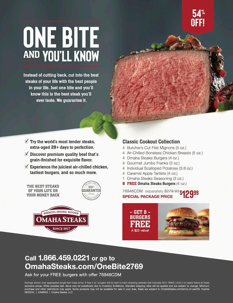 Gourmet Jumbo Franks (3 oz.) 4 Individual Scalloped Potatoes (3.8 oz.) 4 Caramel Apple Tartlets (4 oz.) 1 Omaha Steaks Seasoning (3 oz.) 8 FREE Omaha Steaks Burgers (4 oz.)