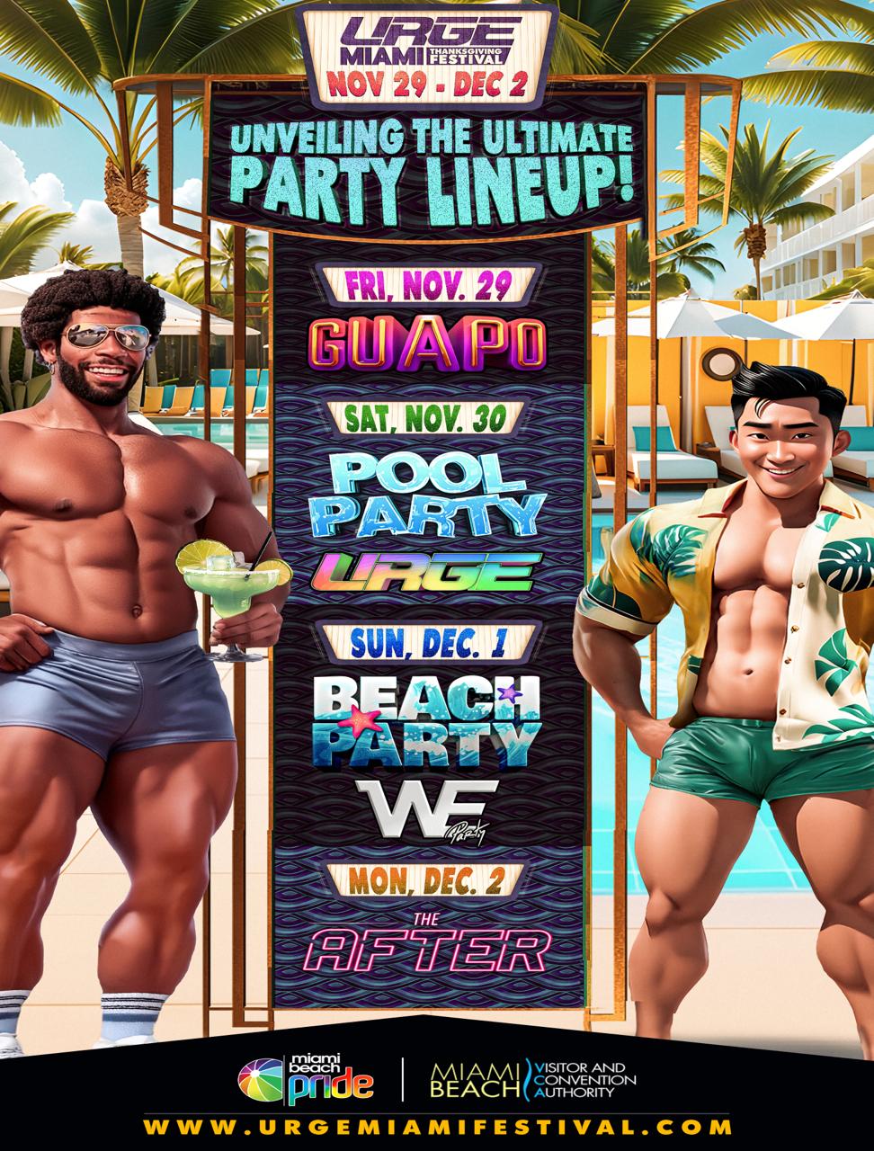 Fall has arrived, although is still feels very much like summer in our alluring Magic City. With the arrival of autumn, it is time to start planning for the return of the URGE Miami Festival Thanksgiving weekend, November 29 to December 2. The 2024 Festival will include three massive night spectaculars, the high-energy Royal Palm Pool Party bash and everyone’s favorite steamy Sunday Beach Party on the beautiful sands of South Beach, hosting thousands of very sexy men from around the world.