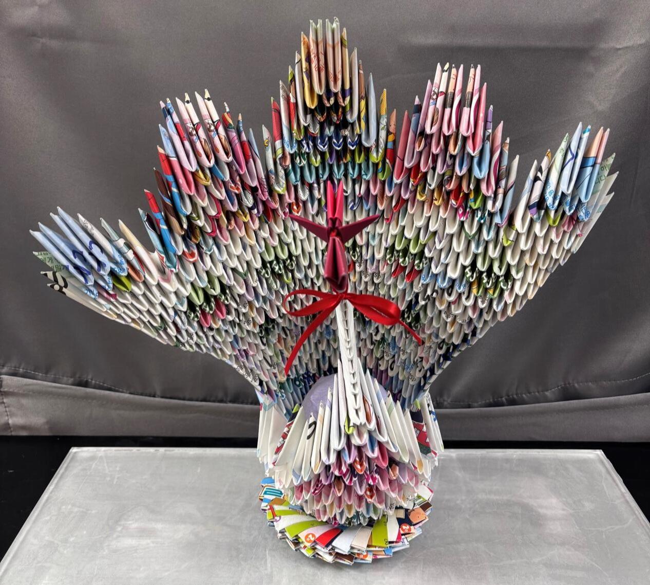 At first folding a simple triangle and repeating more than 1000times, the swan was organized by glue with shaping to a peacock.