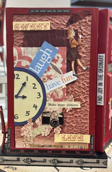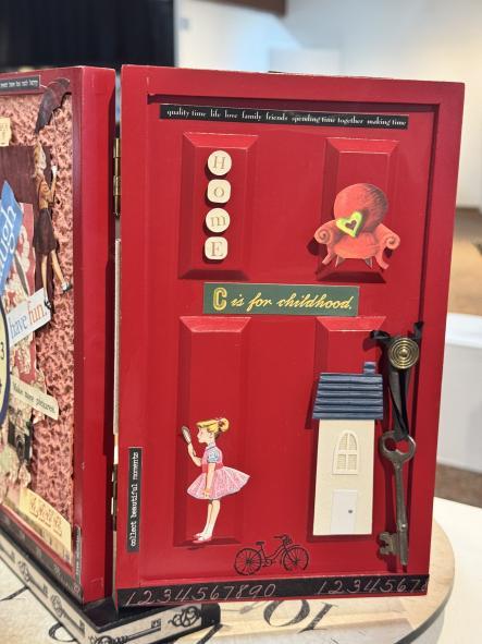 This assemblage illustrates my childhood memories: my love of wearing a cowgirl outfit, sitting in the tallest tree in our yard and daydreaming, and snuggling in a chair with my father reading books. These are moments in time that connect be replaced.