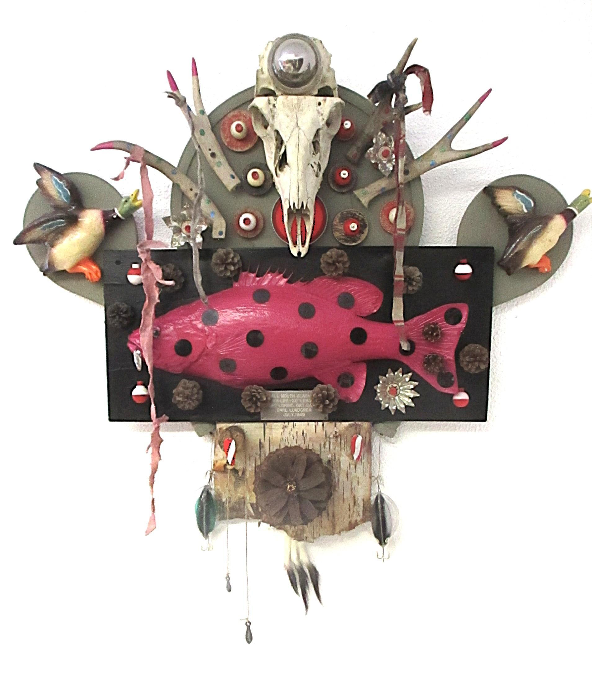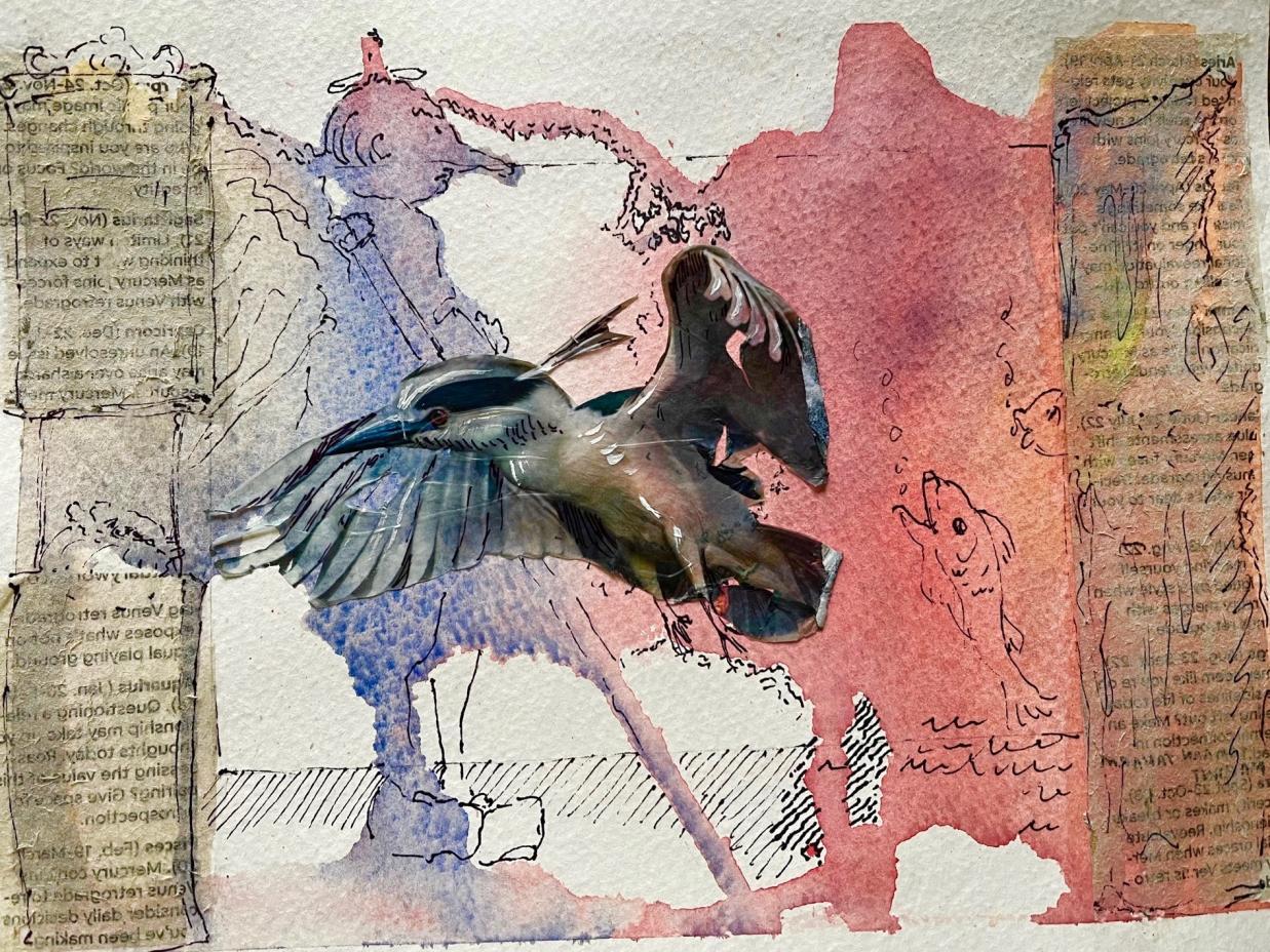 This piece began as a rejected watercolor that evolved through collage with a few twists and turns and playful drawing into a fishing themed, spirit filled mix.