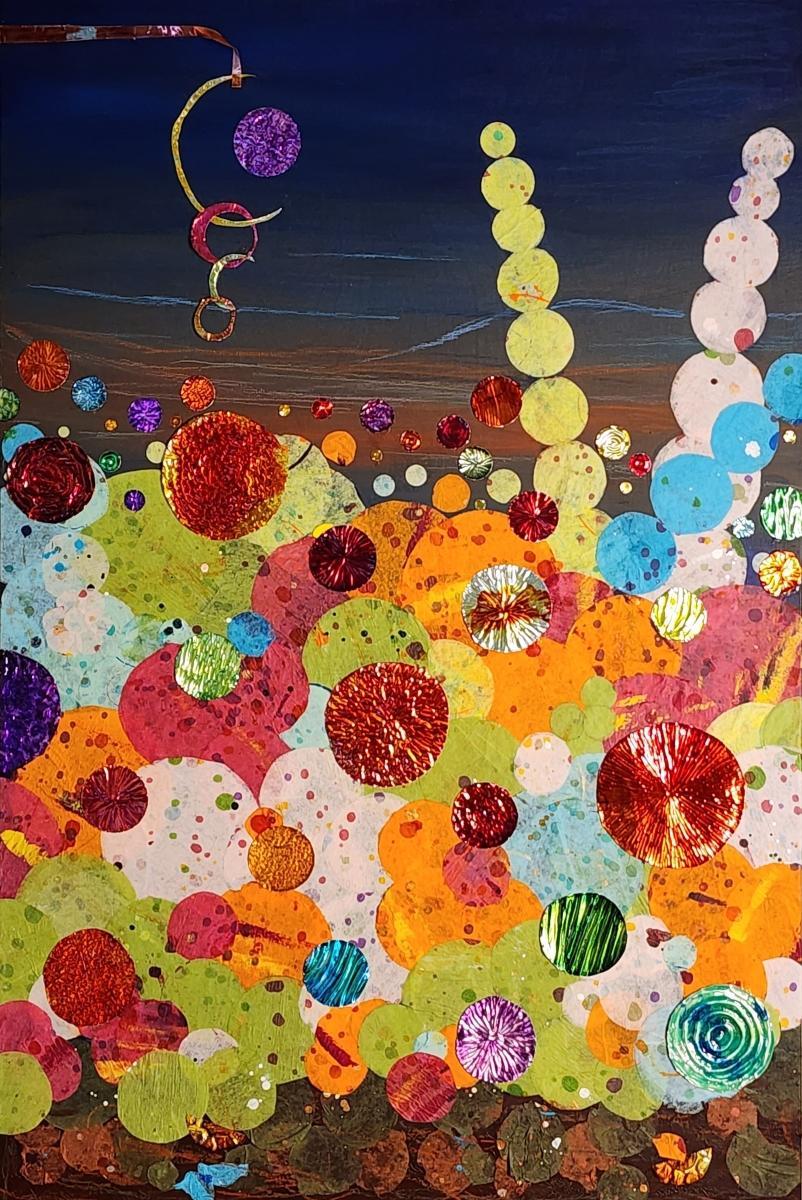 In the fading light, there's lots of circles. Roundness is abundant, in tissue paper, aluminum, alcohol inks and acrylics.