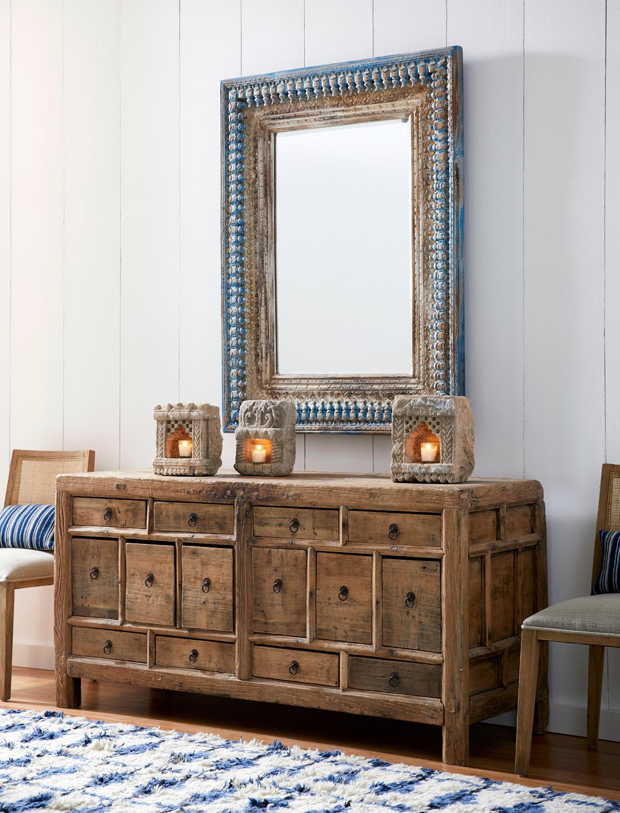 G. Vintage Chinese Rice Cabinet 110-111424 $1,950.00 // H. Hand-Carved Jodhpur Mirror 110-111345 $875.00