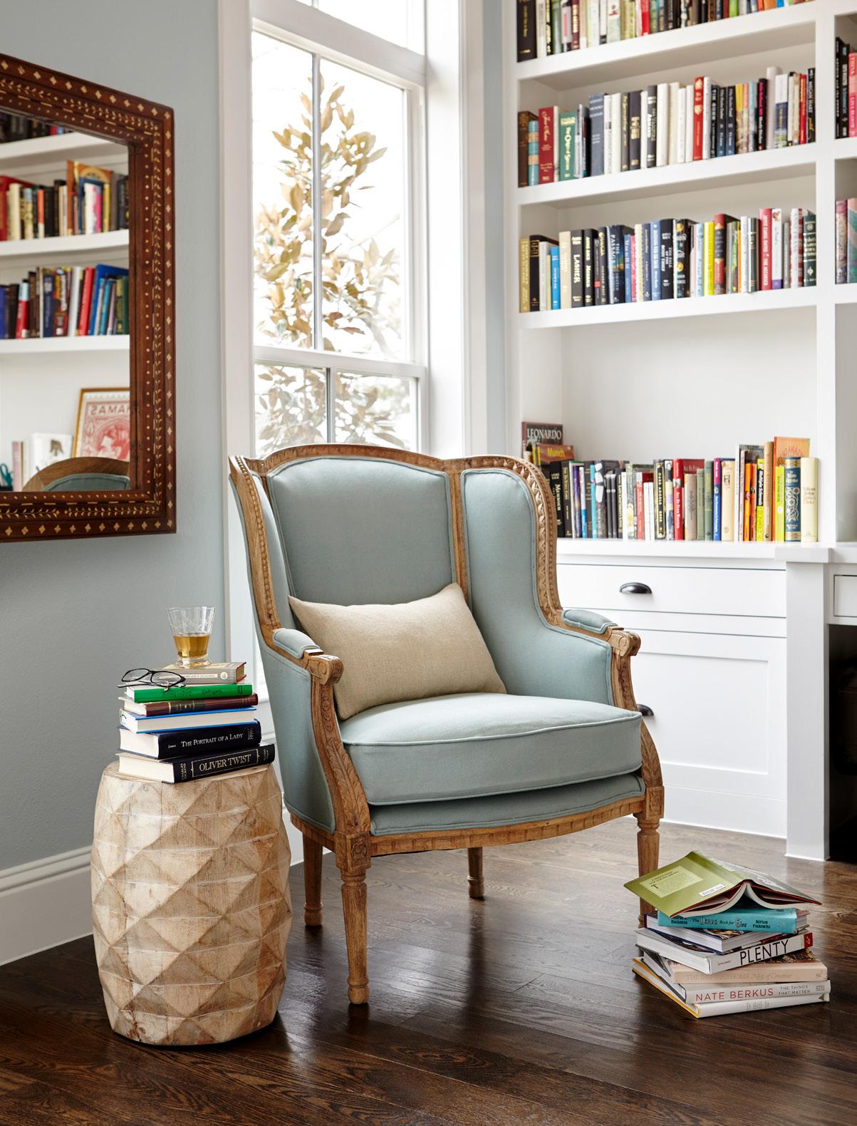 Choose a classic French-style armchair to pair with a shapely, modern coffee table and contemporary wall décor.