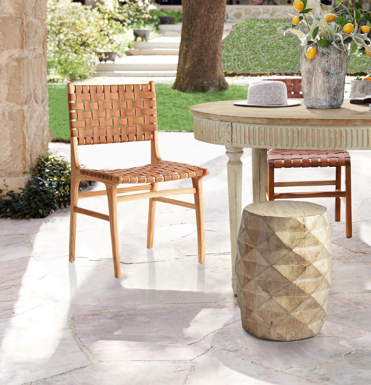 A. Woven Leather Dining Chair, Set of 2 110-1111174 $850.00 // B. Gustavian Extension Table 110-111134 $2,600.00-$3,750.00 C. Pineapple Side Table 110-111292 $325.00 // D. Jasmine Stool 130-111141 $575.00 // E. Blue & White Bone Arabesque Stool 110-111347 $675.00 F. Terrace Stool Table 130-111205 $325.00 // G. Jinyin Stool 130-111137 $550.00 // H. Carver Wooden Stool 138-111144 $225.00 C D E F G H A B 4 // 888.296.8574