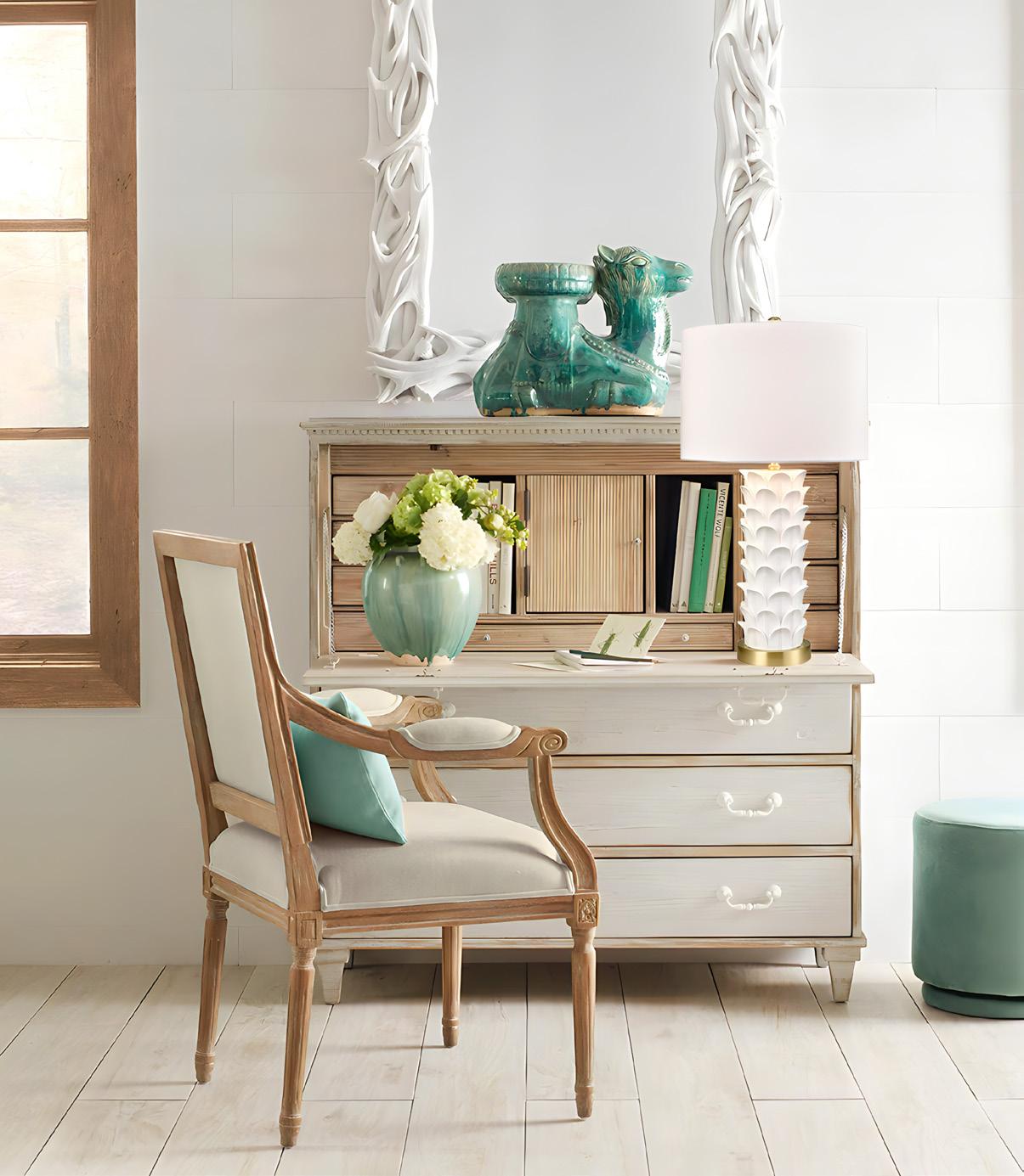 A B C A. Swedish Secretary Chest 110-111222-Natural $1,975.00 // B. Chateau Chair With Arm 110-111119 $775.00 // C. Stacked-Leaf Table Lamp 183-111263 $250.00 D. Serpentine Chest with Marble Top 110-111150 $1,475.00 // E. Sheffield Two Drawer Chest 110-111154 $1,350.00 // F. Moorish Chest 110-111163 $2,975.00 G. Serpentine French Baroque Chest 110-111430 $1,425.00 // H. Lincoln Chest 110-111157 $1,275.00 // J. Directoire Chest 110-111158 $850.00 12 // 888.296.8574