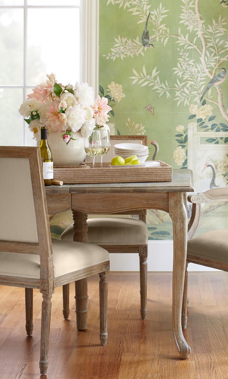 Iron & Marble Wheat Table 110-111309 $1,325.00 // B. Athens Dining Table 183-111242 $2,300.00 // C. White Moorish Dining Table 110-111469 $2,500.00-$2,950.00 // D. Faceted Marble Table 110-111298 $2,625.00 // E. Chateau Chair Without Arm 110-111120 $625.00 // F. French Country Dining Table - Weathered 110-111223 $3,750.00 // G. Woven Leather Dining Chair, Set of 2 110-1111174 $850.00 // H. Rustic Pedestal Table 110-111295 $725.00 // J. Ashby Round Dining Table 182-111346 $1,375.00-$1,575.00 // K. Carrigan Round Dining Table 177-111111 $1,245.00 L. Terry 60" Round Extension Dining Table 182-111325 $3,200.00 // M. Seaside Slats Round Dining Table 118-111687 $3,025.00 G H J K L M WISTERIA.COM // 7