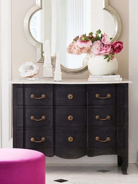 A. Norwich Three-Drawer Chest 110-111152 $975.00 // B. Serpentine Chest with Marble Top 110-111150 $1,475.00 // C. Black Bowfront Chest 110-111151 $1,525.00 // D. Chinese Reclaimed Wood Chest 110-111431 $1,250.00 // E. Antique French Gray Linen Chest 118-111631 $1,575.00