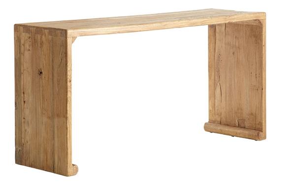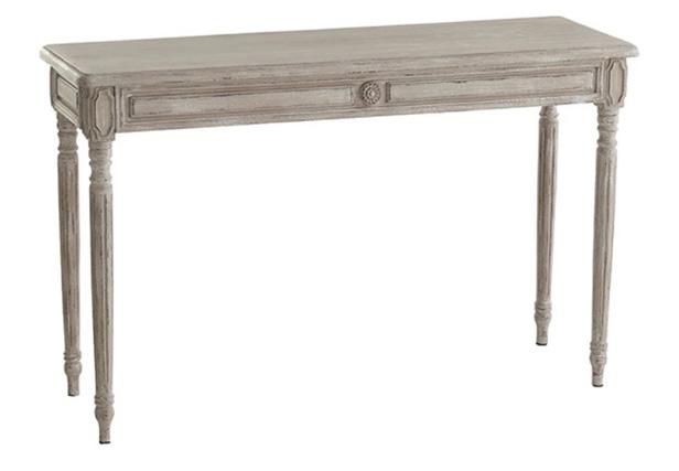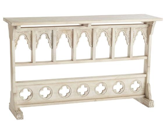 E . Cathedral Limewash Wood Console 110-111343 $750.00 // F. Rustic Console Table 110-111226 $600.00