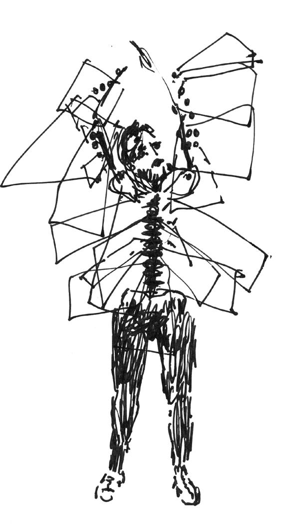 Man Loses History, 2011, wood, pigment, wax, 176 x 70 x 60cm and preparatory sketchbook drawing, ink on paper, 20 x 12.5cm (below). Wits Art Museum collection.