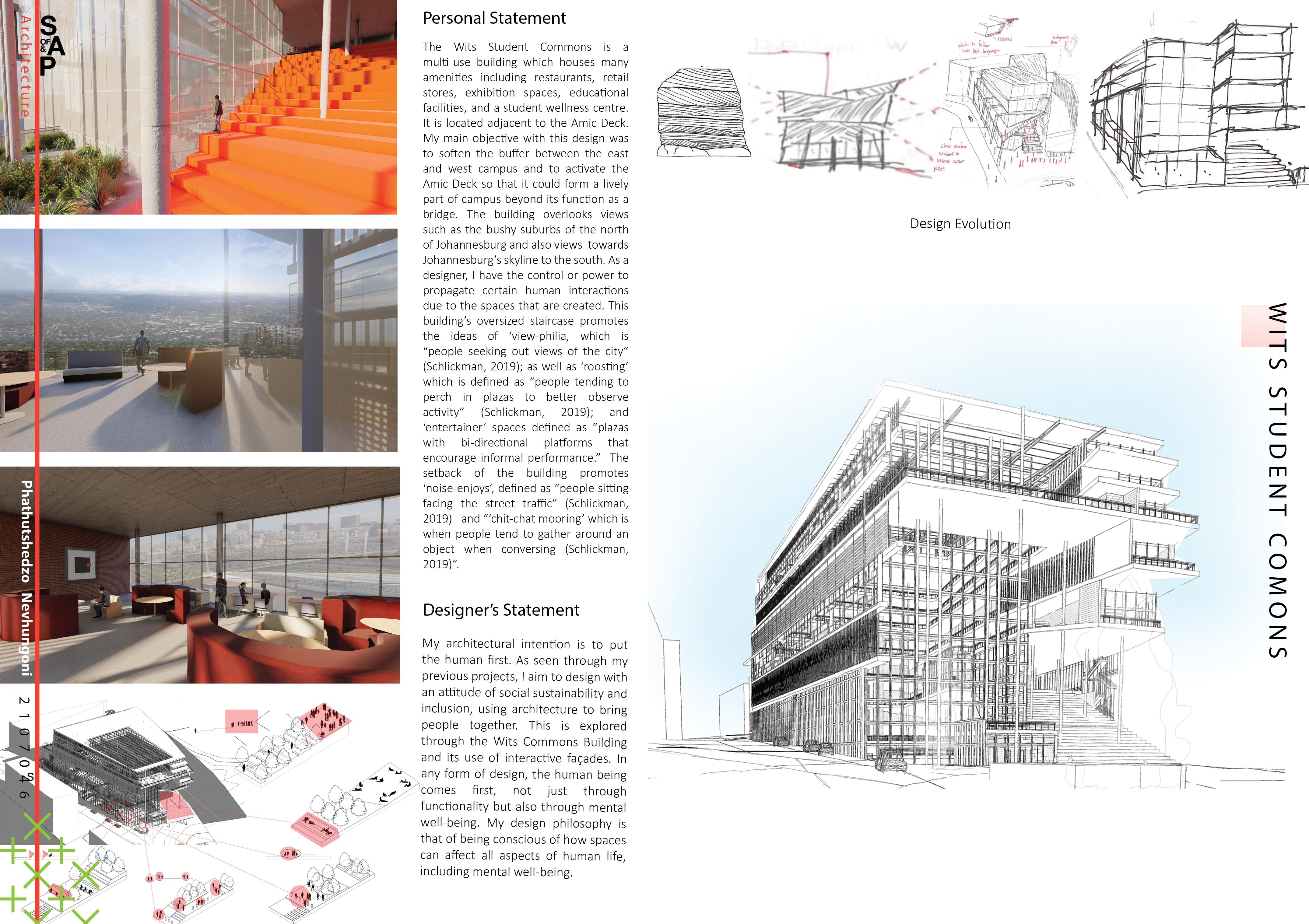 Architecture is an art that is inhabited by the mind, whether this involves human or non-human actors. Therefore, architecture should reflect the needs of conscious beings around it, limi�ng the self-expression of the architect and moving towards the colloquialisa�on of architecture. As a Wits-trained aspiring architect, I value contextually driven, sustainable architecture that is informed by building science, local tradi�ons, and the collabora�on of consultants to bring about architecture that addresses needs, and that brings delight into daily life.