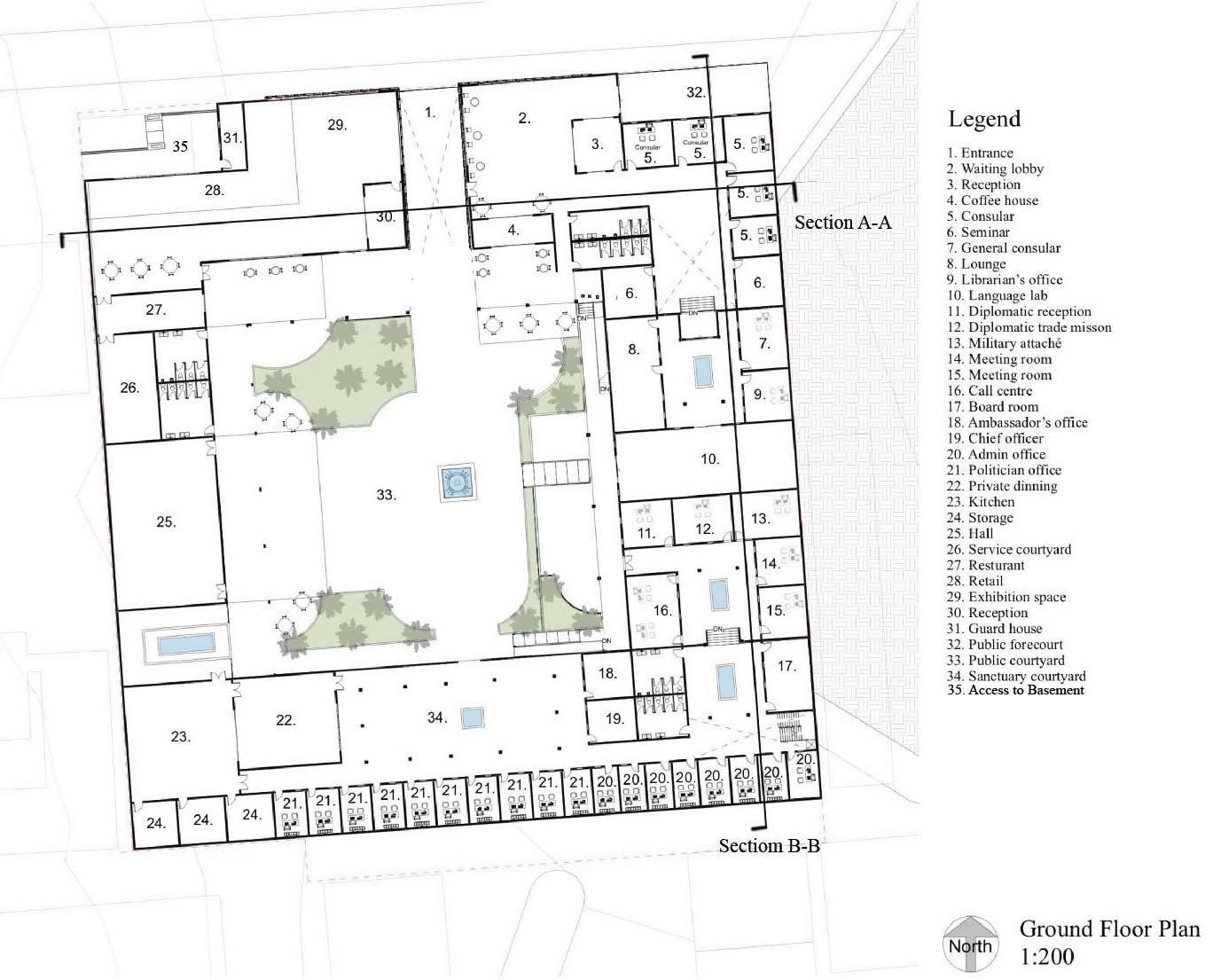 The country I have chosen to design an embassy for is South Sudan. The concept is expressed architecturally by using abstracted forms on the north facade, which are seen in the vernacular architecture of South Sudan. Timber and ver�cal thatch is used for the building facades as it represents the na�ve materiality of the country and contains a low embodied energy. South Sudan suffers from both severe flooding and droughts further to the north. The environmental issue thus chosen for this project is water, as there is a crisis related to water quality and water security. This is highlighted in the design for an embassy building through the small courtyard in the public forecourt, which also func�ons as a water catchment system.