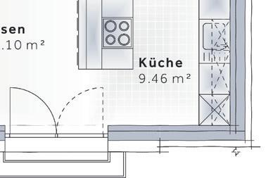 • Bewegungsflächen vor Kücheneinrichtungen sollten mindestens 120 cm x 120 cm (Rollstuhl 150 cm x 150 cm) betragen.