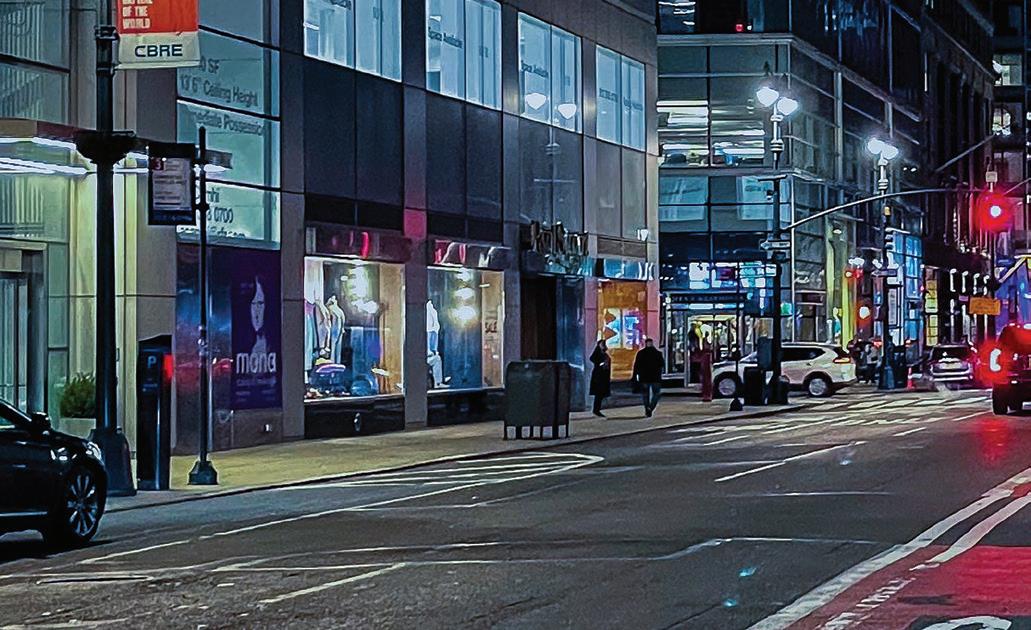 The white in his hair catches the neon signs as he wields the plastic sacks.